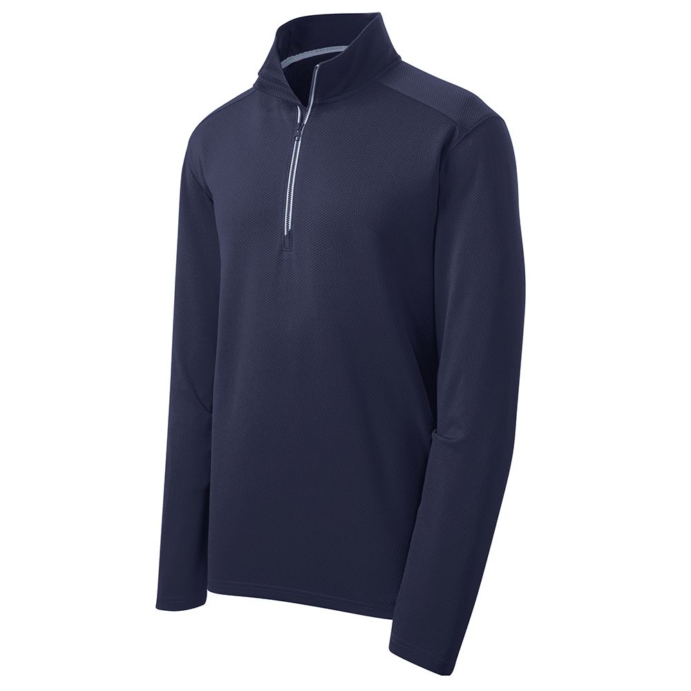 This mid-weight pullover has an unbeatable textured look with contrast zipper taping. Plus it performs by wicking moisture. 100% polyester Cadet collar Tag-free label Taped neckDyed-to-match Vislon zipper and pullSilver zipper tape Angled chin guard for additional comfort Set-in sleeves Open cuffs and hemDue to the nature of 100% polyester performance fabrics special care must be taken throughout the printing process.
