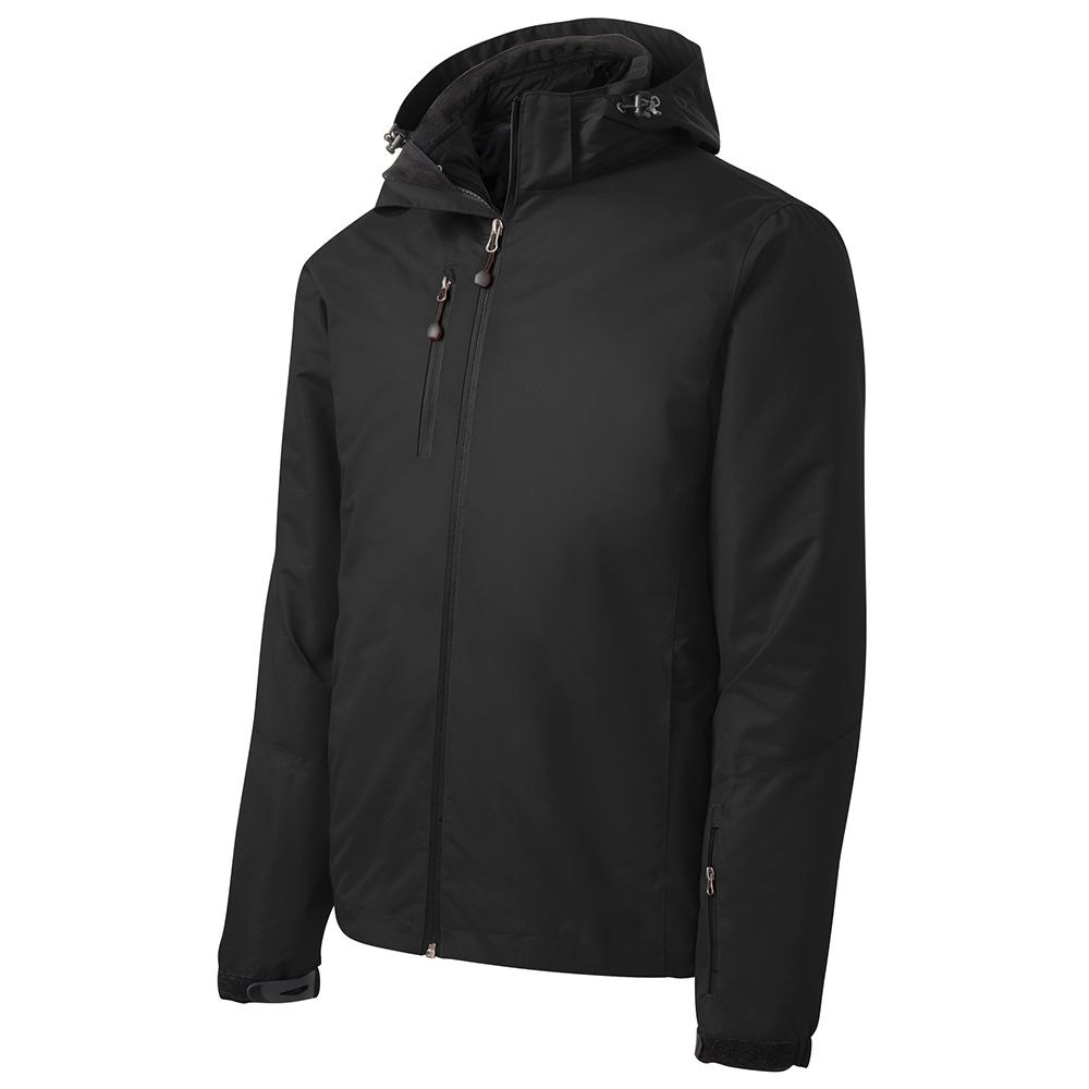 Packed with weather-fighting features the Vortex Waterproof 3-in-1 provides a completely versatile outerwear system in one jacket. The fully seam-sealed waterproof shell and the warm polyfilled inner jacket can be worn separately or combined for optimal warmth and protection. 100% polyester shell 100% nylon zip-in inner jacket with 3-ounce polyfill 3000MM fabric waterproof rating 1000G/M2 fabric breathability rating Detachable hood with locking drawcord Full-length interior storm flap Chin guard Contrast zippered chest and sleeve pockets Front zippered pockets Adjustable tab cuffs with hook and loop closures Port Pocket for easy embroidery access Open hem Inner jacket has front slash pockets and open hem