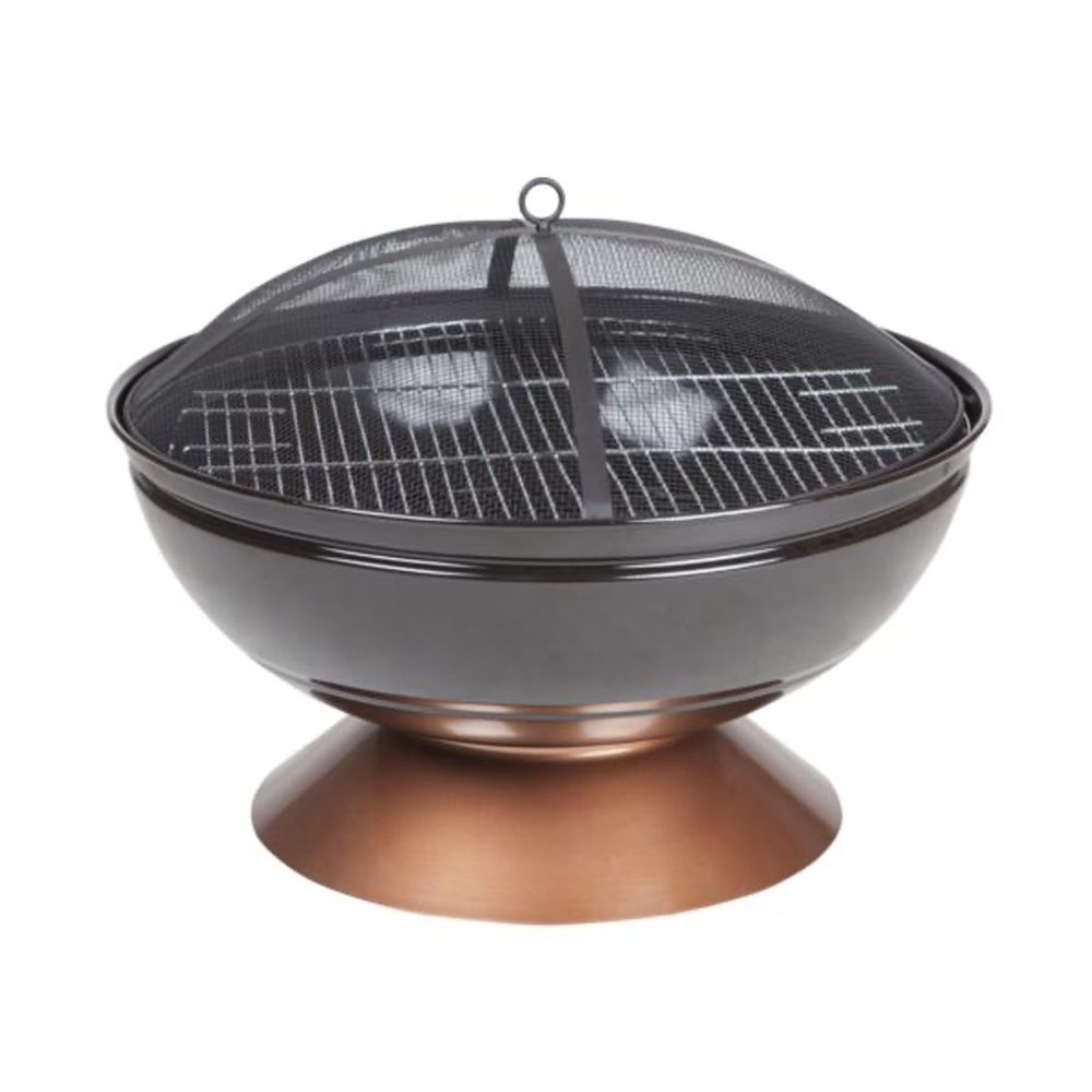 Unique fire pit with an attractive enamel-painted fire bowl and base. Beautiful copper and black gradual finish. Dome mesh spark screen with high heat paint. Features a wood and cooking grates for versatile uses. Includes a screen life tool. Dimensions: 26" Diameter 21" Height.