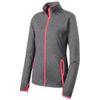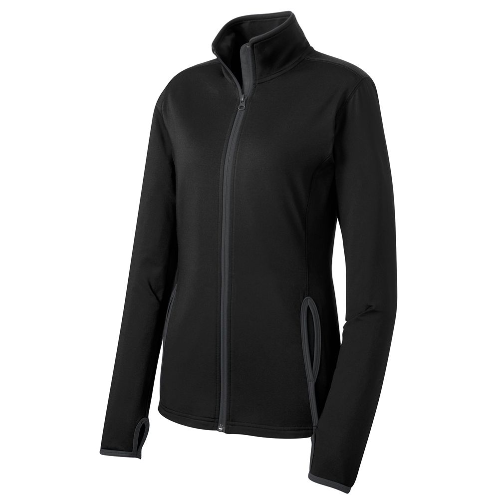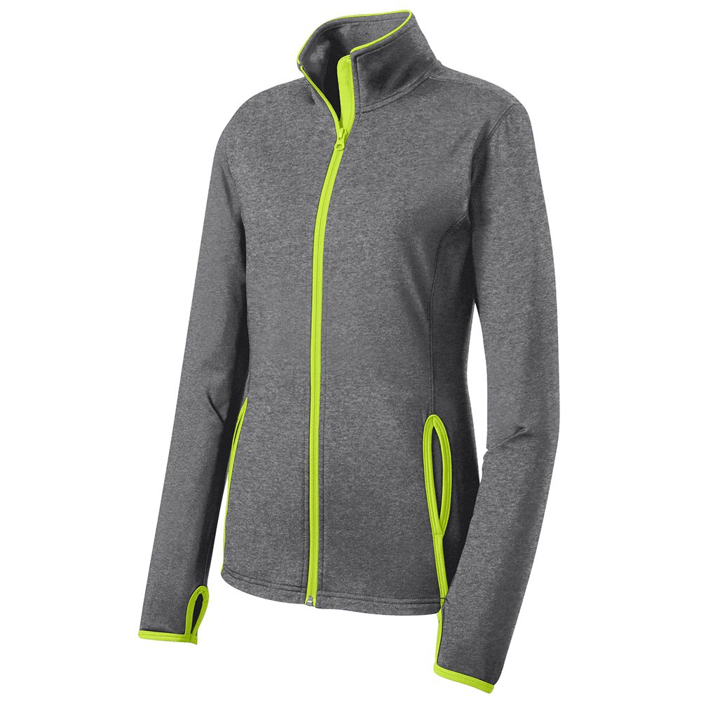 • Keep moving in this moisture-wicking, soft-brushed jacket that's flexible and features hits of contrast color throughout. • 6.8-ounce, 90/10 poly/spandex jersey • Cadet collar with contrast piping • Tag-free label • Taped neck • Contrast reverse coil zipper • Set-in sleeves • Contrast cuff binding • Thumbholes to keep hands warm • Contrast trim at front pockets and thumbholes