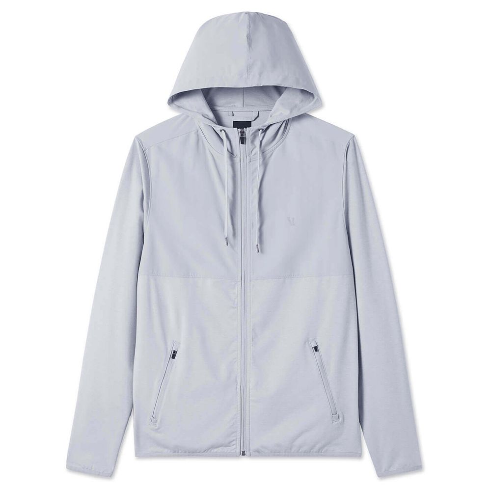 This jacket checks the boxes for both soft performance stretch knit plus a protective nylon shell from 88% recycled material to help protect from the elements. Moisture-wicking fabric along with nylon overlays, a drawcord hoodie, and zip pockets keep you in check. Great for training and running.